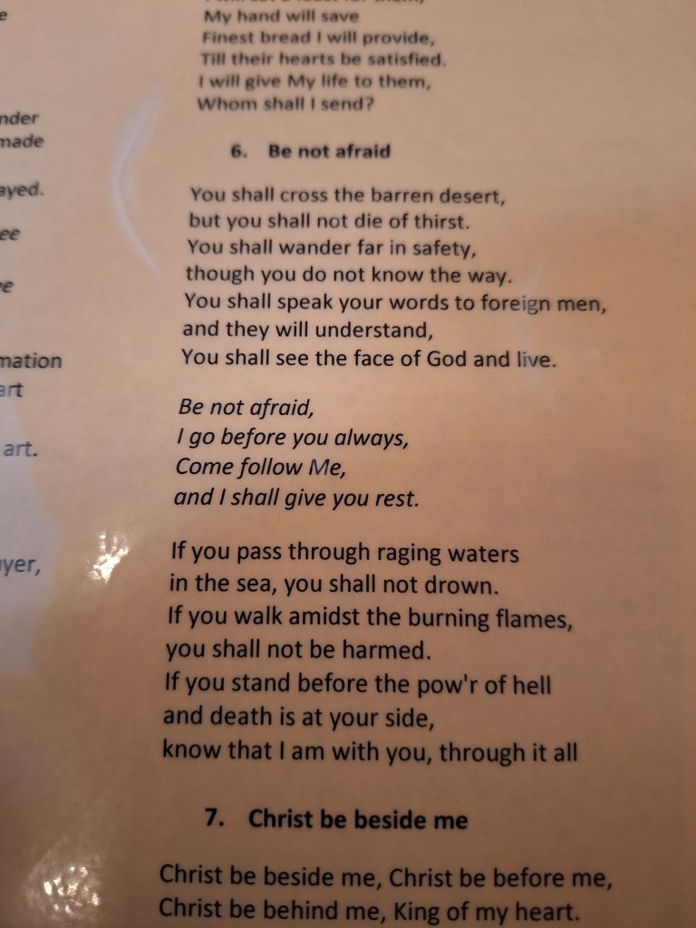 This morning, the 11th, I attended the Pilgrim’s Mass in the magnificent cathedral. They only have the swinging of the botafumeiro on certain holidays now so we didn’t get to witness that. It is a sight to see if you ever get a chance. The mass was in Spanish although it still gives such peace just to be there. I love communion and Catholic tradition asks that you not take communion unless you are Catholic. I respect their tradition and instead go forward for a blessing which touches me. Afterwards there was another mass in a small chapel, spoken in English. I was moved by this hymn we sang together.